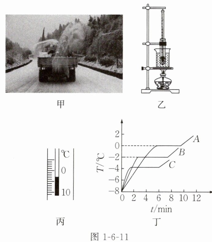 (选填“晶体”或“非晶体”)。(3)完成上述实验后,小张又取了适量淡盐水制成的碎冰,用相同的热源再次加热,得到图 1 - 6 - 11 丁中的 $B$ 图线。再次取适量浓度更大一些的盐水制成的碎冰,用相同的热源加热,得到图 1 - 6 - 11 丁中的 $C$ 图线。由以上实验可知,加入盐后冰的熔点将会