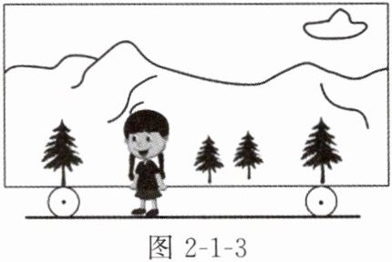 4. 小明设计了一个如图 2-1-3 所示的实验:在桌面上安装一条滑轨,上面放着一幅带轮子的背景画,前面放一个卡通人物画。当推动背景画向左运动时,会感觉卡通人物向