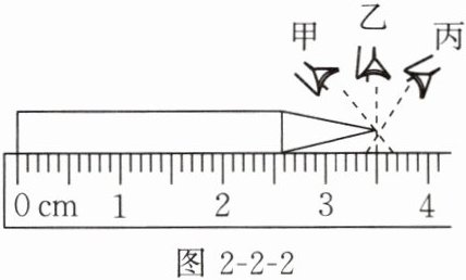 4. 如图2-2-2所示,小宇用刻度尺测量一截铅笔的长度时,他特意从三个不同角度进行读数,发现三种读数结果并不一样。你认为正确的读数角度应该是图2-2-2中的