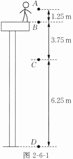 某运动员在女子单人10 m跳台比赛中出色地完成了跳水动作,将其下落阶段中的一段运动简化为直线运动,其中A、B、C、D四点是其下落过程中的四个位置,相邻两点间的时间间隔为0.5 s,距离如图2-6-1所示。该运动员在此过程中,下列说法正确的是(
