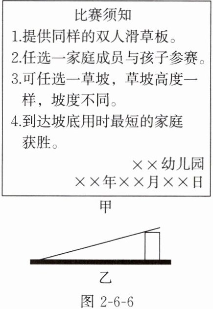 11. (山西晋中中考改编)“六一”儿童节前夕,小明妹妹所在的幼儿园将要举办“亲子滑草”比赛,比赛须知如图2-6-6甲所示。如何赢得比赛呢?小明邀请学习小组的同学们一起进行专题项目研究,并制订参赛方案。