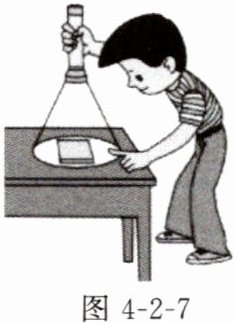 4. 晚上,在桌面上铺一张白纸,把一块小平面镜平放在纸上,让手电筒的光正对着平面镜照射,如图 4-2-7 所示,从侧面看去(