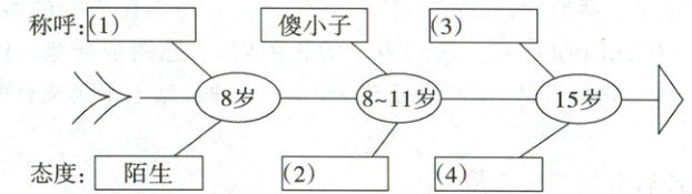 1. (思维导图)文中父亲对“我”的称呼在不同时期各不相同,从中可以体会到父亲对“我”态度的变化。仔细阅读短文,完成下面的思维导图。(2 分)