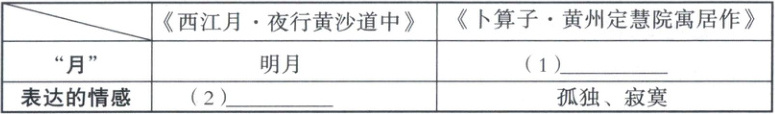 ,《卜算子·黄州定慧院寓居作》的作者是苏轼,二者并称“苏辛”。2. 这两首词都描写了“月”,但表达的情感不同。认真思考,把表格补充完整。