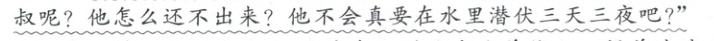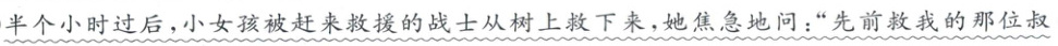 示例:半个小时过后,小女孩被赶来救援的战士从树上救下来,她不停嘟囔:“先前救我的那位叔叔呢?他怎么还不出来?他不会真要在水里潜伏三天三夜吧?”