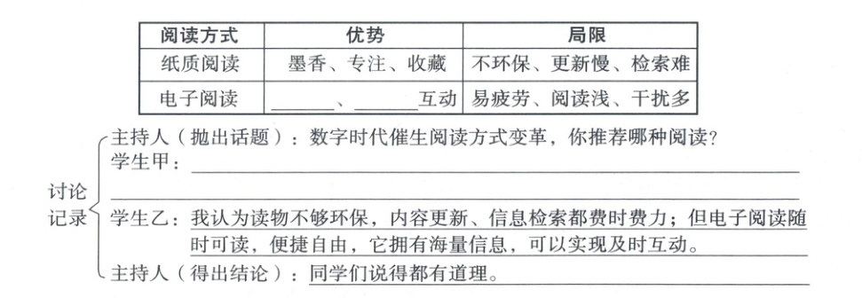 3.示例:我认为纸质阅读有墨香,能让人专注阅读且方便收藏,而电子阅读易使人疲劳,阅读较浅且干扰多,所以我更推荐纸质阅读。