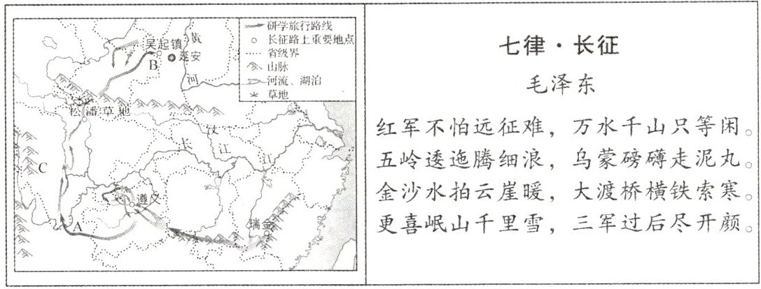 11. 课堂上,老师带领同学们“重走长征路”,并用毛泽东同志所作的一首《七律·长征》,告诉同学们要牢记长征精神,不忘强国初心。读红色研学旅行路线图,完成下列各题。
