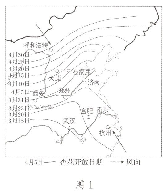 (1)“桃树、杏树、梨树,你不让我,我不让你,都开满了花赶趟儿。”图1中杏花开放的时空变化规律是开放日期由南往北