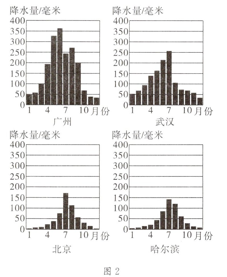 (填“气温”或“降水”)。(2)“雨是最寻常的,一下就是三两天。”由图2可以看出,在我国东部地区,雨季长短的空间分布规律是