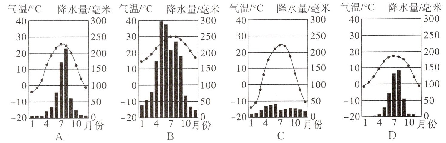 5.D【解析】青藏高原纬度较低,但是海拔高,气温低,影响其气候的主要因素为地形;海南岛终年如夏,降水较多,主要影响因素为纬度位置;新疆塔里木盆地气候干燥,同纬度的北京气候比较湿润,两地距离海洋的远近不同,影响两地干湿程度的主要因素是海陆位置;乌鲁木齐深居内陆,比哈尔滨年降水量少,影响两地年降水量的主要因素是海陆位置。