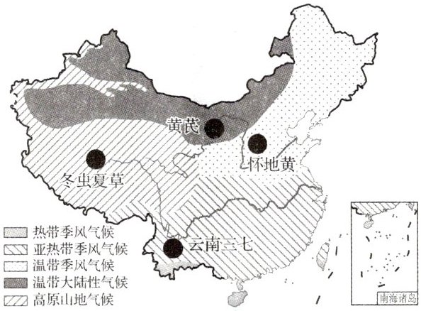 中药以植物药居多,使用也最广泛,故有“诸药以草为本”的说法。因此,古人习惯将中药称为“本草”。读我国气候类型和部分本草分布图,完成第7~8题。