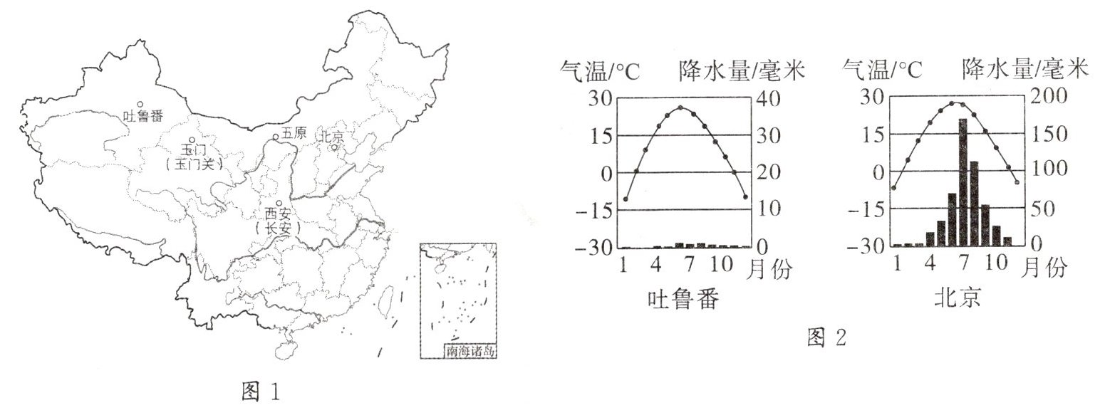 《中国诗词大会》以“赏中华诗词、寻文化基因、品生活之美”为基本宗旨,力求通过对诗词知识的比拼及赏析,带动全民重温那些曾经学过的古诗词,分享诗词之美,感受诗词之趣,从古人的智慧和情怀中汲取营养,涵养身心。下图为部分地区在我国的位置图(图1)和吐鲁番、北京多年平均各月气温和降水量图(图2)。