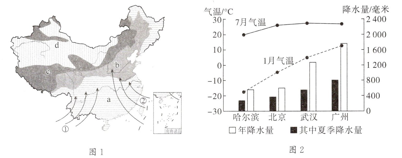 9.D10.D【解析】第9题,根据图中风向判断,西南季风①来自印度洋,东南季风②来自太平洋,该图反映的季节是夏季;受图1中季风的影响,我国年降水量从东南沿海向西北内陆递减;d地区为干旱区,由于其深居内陆,离海洋较远,受夏季风影响较弱,降水稀少,以荒漠植被或裸露的沙漠、戈壁为主。第10题,哈尔滨、北京、武汉、广州这四个城市,由北向南分布,纬度跨度较大,但是它们都位于我国季风气候区内,夏季降水量主要是受夏季风的影响。我国东部以季风气候为主,夏季盛行来自海洋的偏南风,夏季风从海洋带来大量水汽,南方城市离海洋更近,受夏季风影响时间更长、强度更大。广州纬度较低,夏季风到来早、离开晚,雨季长,降水多;哈尔滨纬度较高,夏季风到来晚、离开早,雨季短,降水相对少。