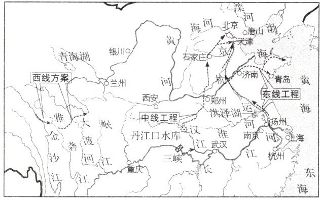 南水北调是我国著名的跨流域调水工程。截至目前,南水北调中线工程已经安全运行一段时间,生态效益、经济效益和社会效益日益显著。读南水北调工程线路示意图,完成第2~3题。
