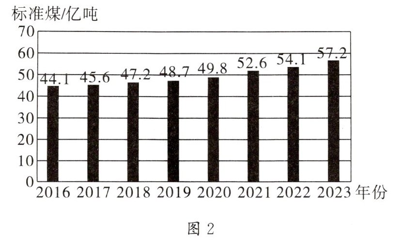 6. 图1为2016—2023年我国煤炭、石油、清洁能源消费比重统计图,图2为2016—2023年我国能源消费总量柱状统计图。读图,完成下列各题。