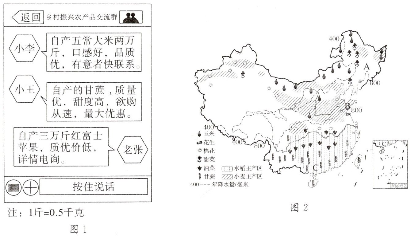 聊天软件现已成为便捷的交流方式,农产品供需交流群成为农产品的网上集市。下面两幅图分别是乡村振兴农产品交流群截屏(图1)和中国部分农产品分布示意图(图2)。
