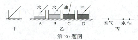 ②实验时,同学们在水槽底部贴上一把自制纸质刻度尺,这样做的目的是便于确定折射光线的位置,直接读出斑点移动的距离。某小组同学正确实验后,所记录的三次光斑的相对位置如图丙所示,经分析可知:光从空气斜射入水和油时,