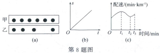 8. (2024·西安期末)物理上常用“频闪照相”来研究物体的运动,如图(a)是照相机记录甲、乙两物体运动的频闪照片,已知照片曝光时间间隔一定;如图(c)所示是跑步者用随身携带的手机软件记录的“配速”(跑 $ 1 \, km $ 路程所需要的时间)随时间变化的关系图像。下列说法正确的是 (