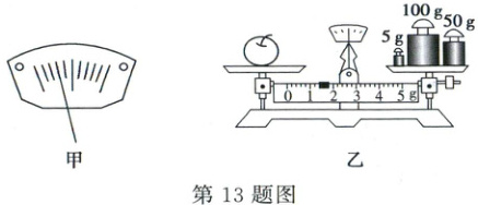 13. 小明用天平测量苹果的质量。在调节天平平衡的过程中,发现指针如图甲所示,他应将平衡螺母向 (