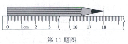 11. 一只小虫跌落在小李的新铅笔上,小李突发奇想,驱赶小虫从铅笔的左端爬到右端用时 $ 5 \, s $,并用刻度尺测量铅笔的长度,如图所示,铅笔的长度是 $□$