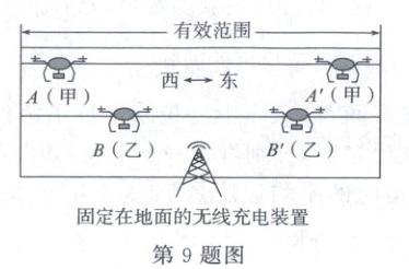 9. (2024·聊城期中)如图所示是无人机无线充电模型,当无人机进入充电装置所发电磁波的有效范围内即可充电。甲、乙无人机沿水平方向匀速运动,经过相同时间,它们分别从位置 $ A $、$ B $ 到达位置 $ A' $、$ B' $,下列说法正确的是 (