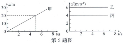 B 解析:甲车运动的s-t图像是一条过原点的倾斜直线,说明路程和时间成正比,即路程和时间的比值是一个定值,甲车的速度为$v_{甲}=\frac {s_{甲}}{t_{甲}}=\frac {20m}{5s}=4m/s$;乙车运动的图像是v-t图像,速度不随时间的变化而变化,是一个定值,乙车的速度为$v_{乙}=6m/s$;丙车运动的图像也是v-t图像,速度不随时间的变化而变化,是一个定值,丙车的速度为$v_{丙}=4m/s$;综合以上分析可知,速度最大的小车是乙,甲和丙速度相同,故A错误;乙车在5s内运动的路程为$s=v_{乙}t=6m/s×5s=30m$,故B正确;甲、乙、丙三辆小车同时、同地向同一方向运动,甲的速度小于乙的速度,以甲车为参照物,乙车是运动的,故C错误;甲车、乙车和丙车都做匀速直线运动,故D错误。故选B。