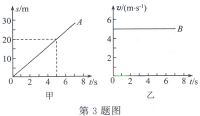 3. (8 分)$A$、$B$两辆汽车在平直的公路上行驶,图甲是汽车$A行驶的路程s和时间t$的关系图像,图乙是汽车$B的速度v和时间t$的关系图像。由图像可知,两车速度的关系是$v_{A}$