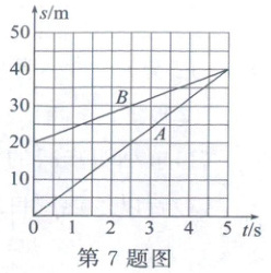 B 解析:根据图像可知,A从参考点出发,而B从距参考点正方向上20m处出发,故①错误;运动2.5s后,A在20m的位置,B在30m的位置,故A和B相距30m-20m=10m,故②正确;运动5s后,A与B都在40m的位置,因此A、B相遇,故③正确;根据图像可知,A、B都运动5s时,A运动的距离为40m,B运动的距离为40m-20m=20m,显然相同时间内A通过的路程大于B通过的路程,因此A的速度大于B的速度,故④错误。故B正确,A、C、D错误。故选B。