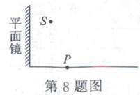 8. (5分)(2024·日照期末)如图,墙壁上竖直放置着一块平面镜,小明将激光笔从S点照向平面镜,在地面上的P点看到一个光斑,请根据平面镜成像的特点画出激光笔的光路图。