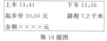 19. (8 分)如图所示是小明乘坐出租车后获得的车费发票,车票上显示了一些数据,试根据其中的有关数据回答下列问题。