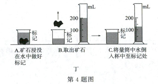 为准。测量矿石的体积时,因矿石较大,放不进量筒,因此小明利用一个烧杯,按图丁所示的方法来测量矿石的体积。图丁中所用量筒的最大测量值是200
