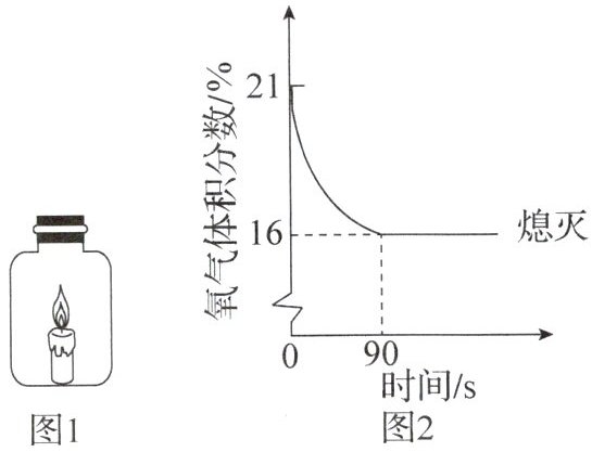 5. 将燃着的蜡烛放在图1所示的密闭容器中,同时用氧气传感器测出密闭容器内氧气体积分数的变化如图2所示。下列说法不正确的是(