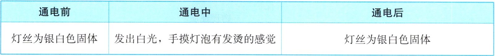 分析:通电前后,钨丝本身没有发生变化,灯泡通电发光、放热属于