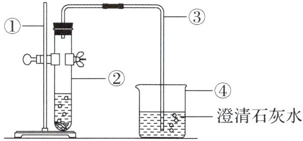 6. 把少量大理石放在干燥的容器②中,向其中加入少量稀盐酸,用配有玻璃弯管的橡胶塞塞紧容器口,使弯管的另一端伸入盛有澄清石灰水的容器④里,如图所示。请回答下列问题。