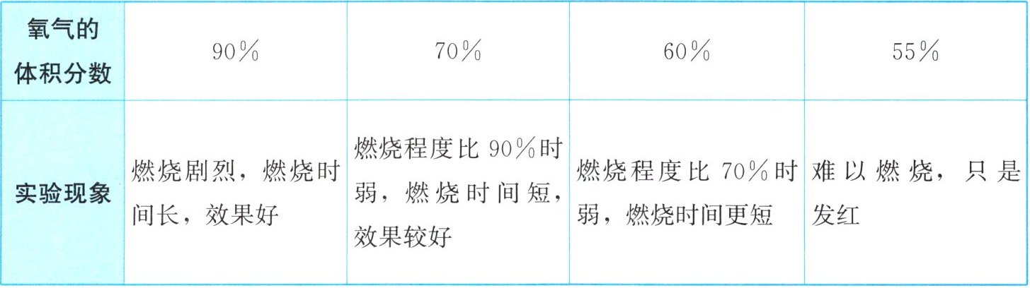 取含碳量和长短相同、直径均为0.38mm的铁丝,分别在氧气的体积分数(氧气体积占混合气体总体积的百分比)为90%、70%、60%、55%的混合气体中进行燃烧实验。