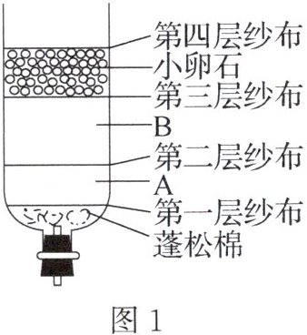 (3)可再用图 1 所示装置除去异味和颜色。图中所示是用饮料瓶、带导管的单孔橡胶塞、蓬松棉、纱布、活性炭、小卵石、石英砂等材料自制的简易净水器。