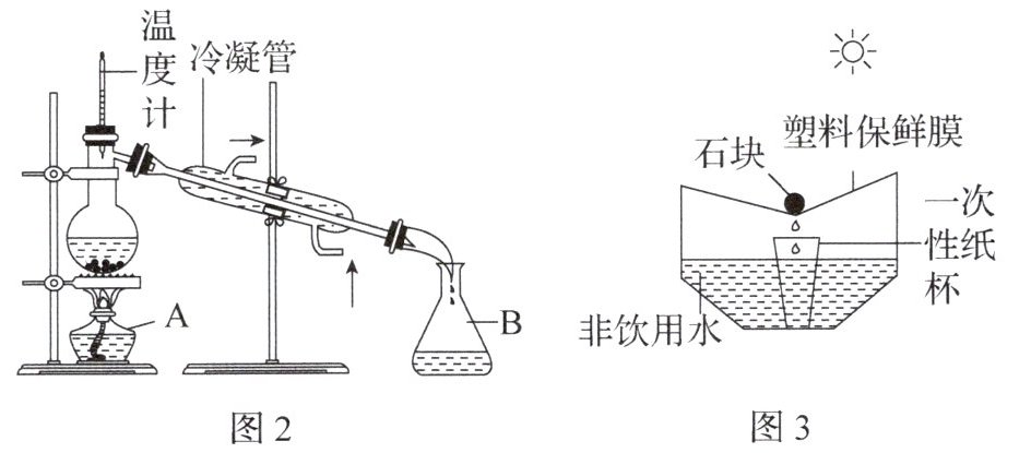实验室用蒸馏法获得蒸馏水,如图 2 所示。某同学利用蒸馏的原理设计野外饮用水简易净化装置,对非饮用水经阳光暴晒后进行净化,如图 3 所示。请结合装置图回答下列问题。