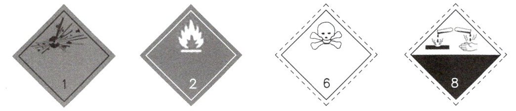 当心爆炸—爆炸性物质;当心火灾—易燃物质;剧毒品;腐蚀品