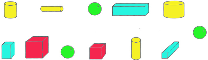 给正方体涂上红色,给长方体涂上蓝色,给圆柱涂上黄色,给球涂上绿色。
