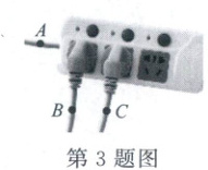 3. (2024·连云港模拟)如图所示为家用插线板示意图,图中 $ A $ 线接入家庭电路中,$ B $ 线接台灯,$ C $ 线接取暖器,两个用电器均正常工作时,$ A $、$ B $、$ C $ 三处的电流分别为 $ I_{A} $、$ I_{B} $、$ I_{C} $,则它们的大小关系正确的是(