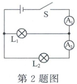 2. (2025·衡阳模拟)如图所示电路中,闭合开关后,电流表 $ A_{1} $ 的示数为 $ 2\ A $,电流表 $ A_{2} $ 的示数为 $ 1.2\ A $,则灯 $ L_{1} $ 和 $ L_{2} $ 中的电流分别是(