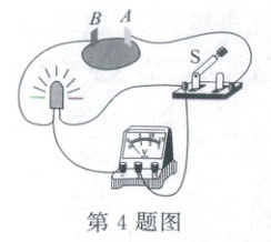 4. 如图所示,将 $ A $、$ B $ 两种不同的金属片分别插入土豆,制成“土豆电池”。闭合开关 $ S $,发光二极管发光,电压表有示数,下列说法正确的是(