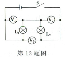 12. 如图所示,闭合开关后,其中电压表 $ V_{1} $、$ V_{2} $ 和 $ V_{3} $ 的示数分别为 $ U_{1} $、$ U_{2} $ 和 $ U_{3} $,则三个电压表示数之间存在的关系是