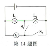 14. 如图所示,电源电压保持不变,当 $ S_{1} $ 闭合,$ S_{2} $ 断开时,电压表的示数为 $ 4\ V $;当 $ S_{1} $ 断开,$ S_{2} $ 闭合时,电压表的示数为 $ 6.2\ V $,则此时灯 $ L_{1} $ 和 $ L_{2} $ 两端的电压分别是 $□$