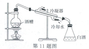 11. (2024·泸州中考改编)蒸馏法在酿酒过程中得到广泛应用,如图所示为蒸馏过程的原理图,烧瓶内装有含酒精和水的酒糟,在蒸馏的过程中,下列涉及的物理知识说法正确的是(