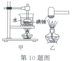 10. 在观察“碘锤”中的物态变化之前,查阅资料得知酒精灯外焰的温度约为$500^{\circ}C$,碘的熔点为$114^{\circ}C$,采用如图甲、乙所示的两种方式加热,下列说法错误的是(