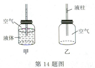 14. 如图甲所示是某同学自制的一个简易气压计,在温度相同的情况下,大气压越高,甲中玻璃管内的液柱高度就越