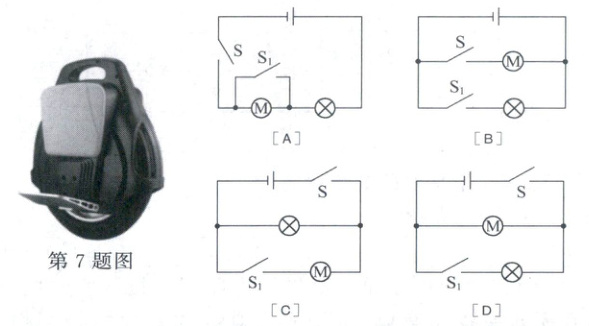 7. (4分)(2024·遂宁中考)图中的电动独轮车依靠电力驱动,低碳环保。当电源开关 $ S $ 闭合时指示灯亮起,独轮车处于待机状态,当人站在独轮车上时开关 $ S_{1} $ 自动闭合,电动机工作,独轮车才开始运动。下列电路设计符合上述要求的是(