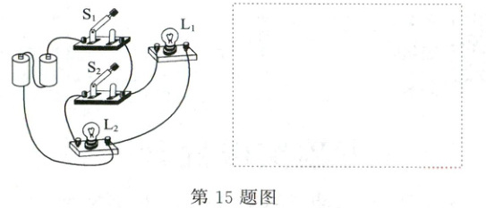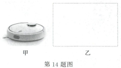 14. (7分)如图甲所示是妈妈新买的某品牌扫地机器人,其内部由可充电电池、一个电源指示灯、一个电动机和两个开关组成。开关 $ S_{1} $ 只控制电源指示灯 $ L $,开关 $ S_{2} $ 只控制扫地用的电动机 $ M $。请在图乙虚线框内画出该扫地机器人内部的简易电路图。