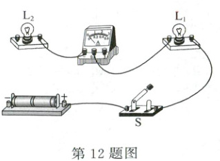 12. (6分)请用笔画线代替导线,将图中的元件连成符合下列要求的电路。要求:$ L_{1} $ 和 $ L_{2} $ 并联,电流表测通过 $ L_{1} $ 的电流,开关 $ S $ 控制 $ L_{1} $ 和 $ L_{2} $。